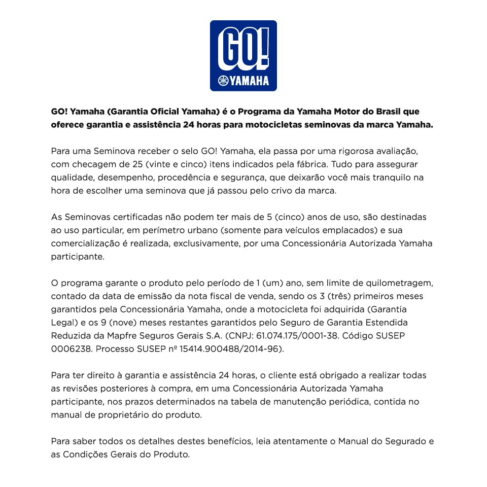 Quando você compra um produto da marca Yamaha, pode ser necessário compartilhar seus dados com o Grupo Yamaha, que são empresas Terceiras, seja para assegurar o fornecimento de garantia, cumprimento de leis, gestão de estoque, produtos e serviços, envio de comunicações, acompanhamento e pesquisas, como pesquisas de satisfação ou proteção ao crédito. Para conhecer mais sobre as práticas de privacidade da Yamaha, acesse a Política de Privacidade deles em: https://www3.yamaha-motor.com.br/politicadeprivacidade.